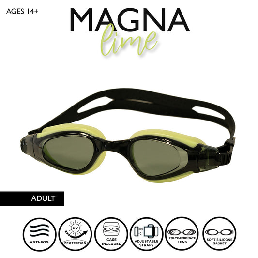 Maru Magna Swim Goggles Anti-Fog, Clear Vision with UV Protection, Black and Lime